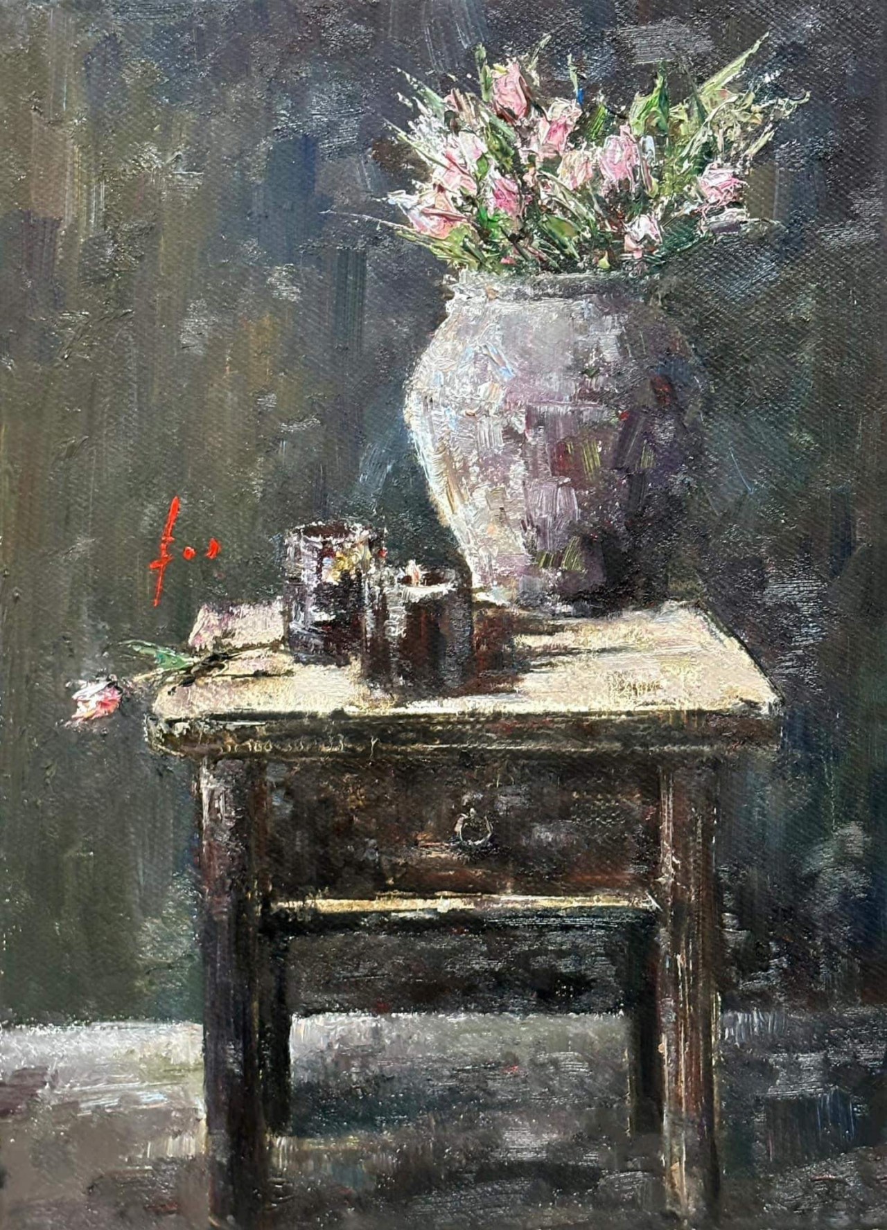 作畫逾三十年的古老師,將大自然恩賜的花卉及原野風光,化為顏色、結構及純粹的元素,運用其細膩的筆觸和瑰麗的色彩,刻劃出斑斕的光影,其濃厚的文學底蘊及豐富的內在生命,使每一筆、每一彩隨著晨昏與四季,變幻得更為鮮活立體。