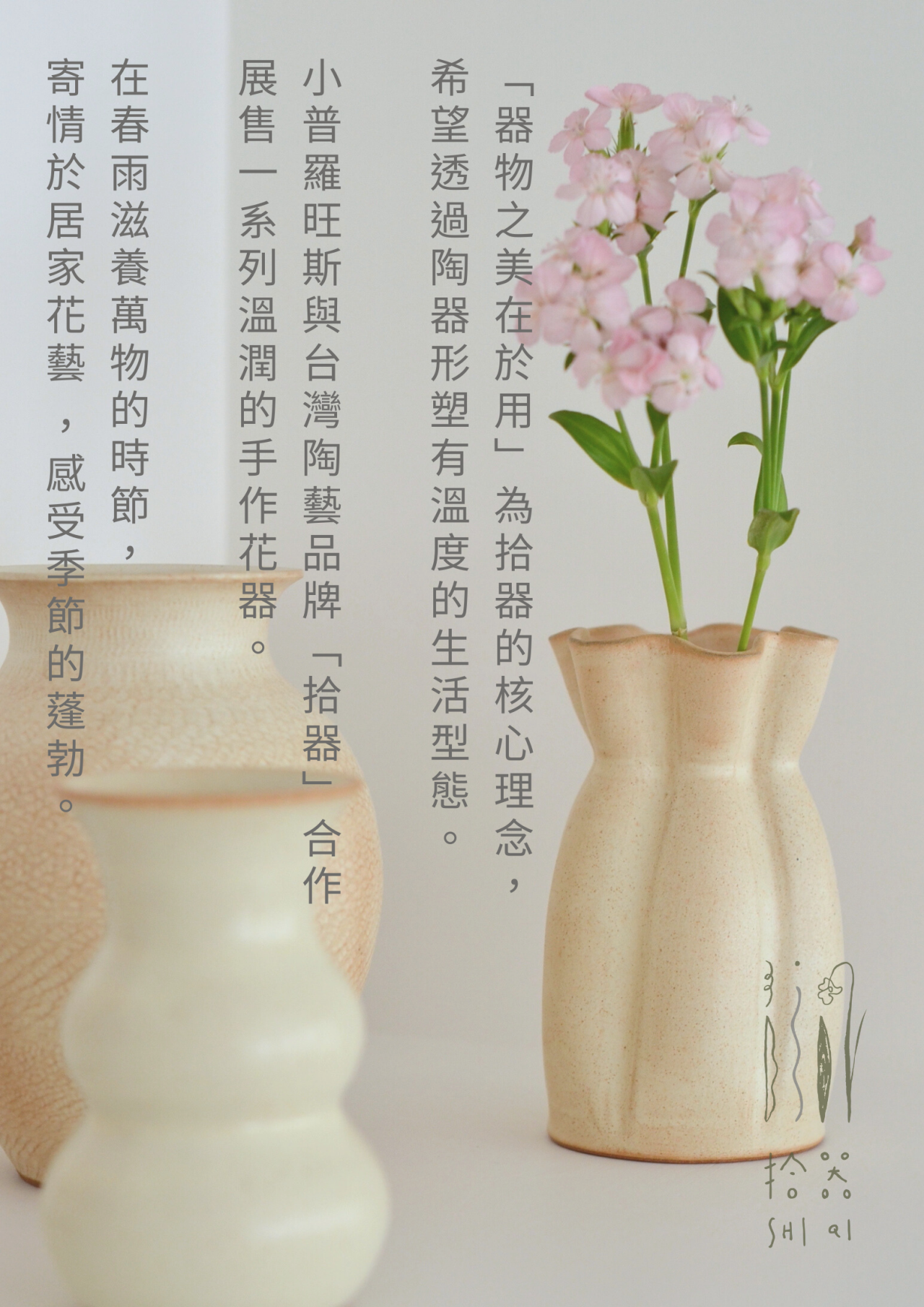 很開心與台灣陶藝家「拾器」合作, 今起在{小普羅旺斯}展售一系列的手工陶器, 本次展出作品以「植物器物」為主題, 我們和陶藝家一同挑選了四種絕美釉色— 月白、灰紫、暖膚、青綠。 月白和灰紫散發沉靜典雅之美、暖膚柔潤淡雅、 青綠則能展現釉色流淌的變化, 讓每件獨一無二的器物裝飾居家, 透過清鮮花草的點綴,感受四季更迭的自然風貌。