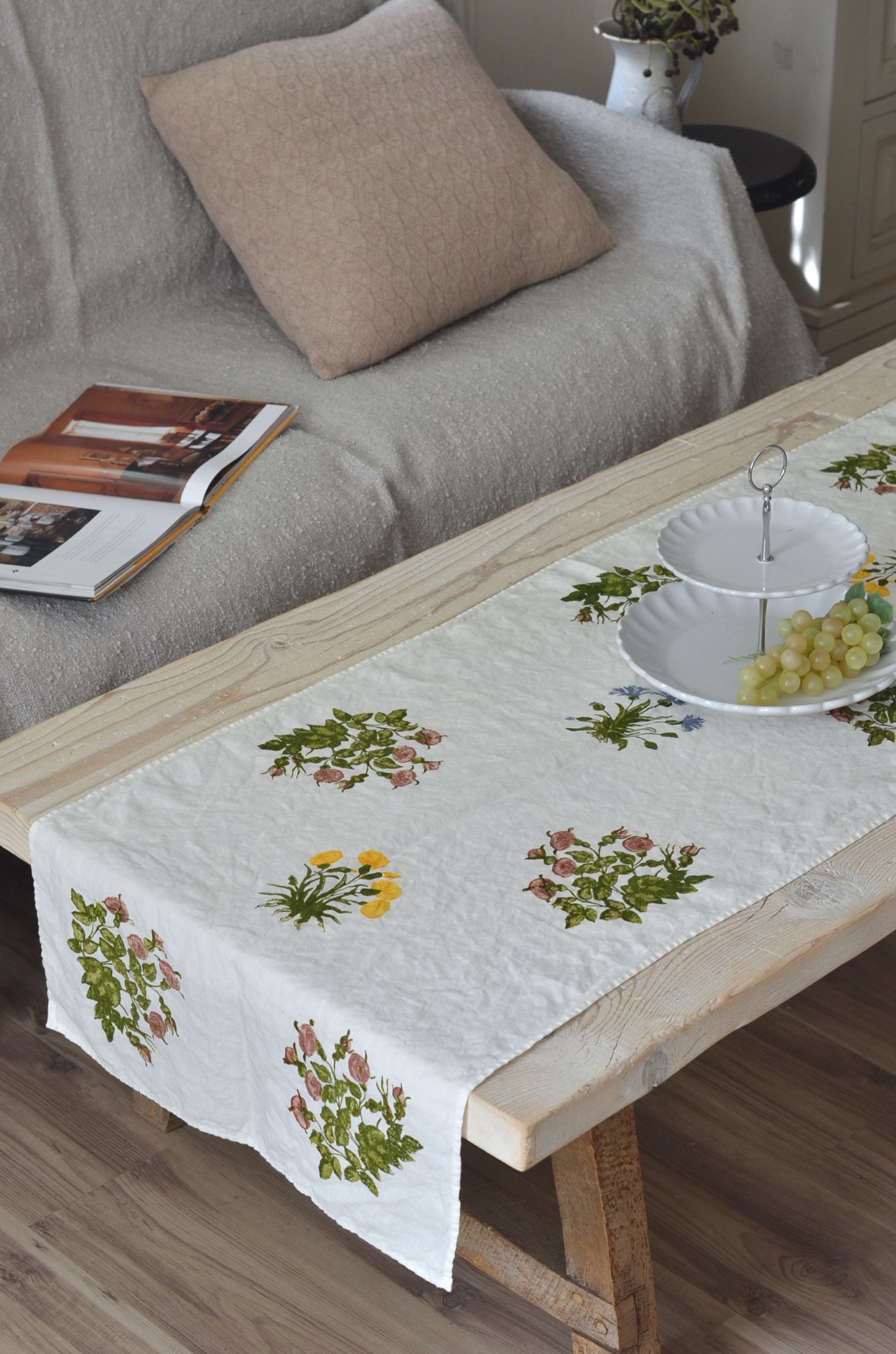 的康乃馨、玫瑰和矢車菊圖案融入織品中