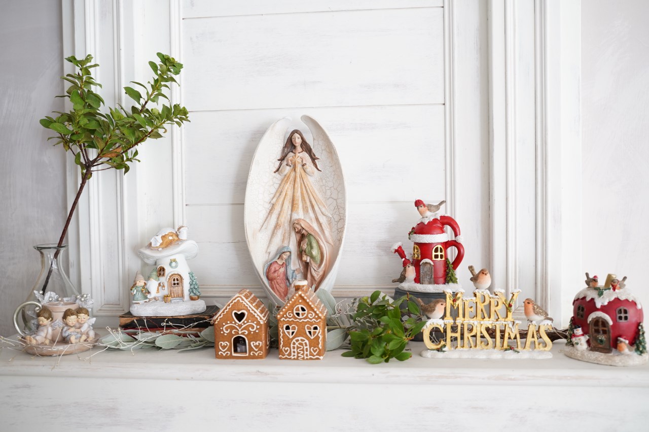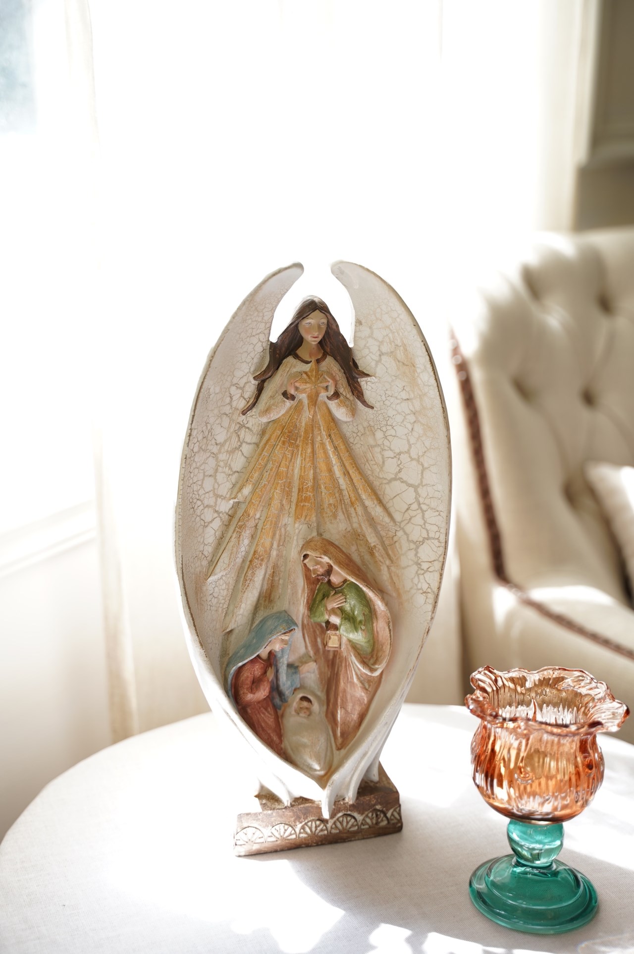 畫面溫柔祥和的耶穌誕生擺飾, 淡色調裡刻畫了許多小細節, 馬廄裡的聖嬰、藍袍聖母、 牛與驢和遠方耶路薩冷的建築景深, 雖是宗教擺飾 擺在家也十分協調~ 適中的尺寸適合放在玄關、客廳, 幽靜祥和的氛圍下有新生、有祝福, 整個家彷彿也溢滿了無形的光輝~
