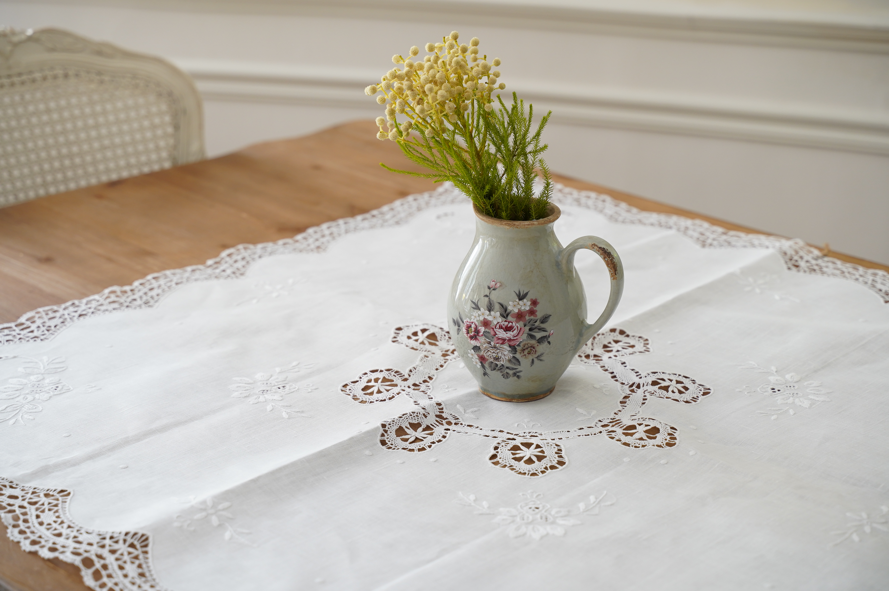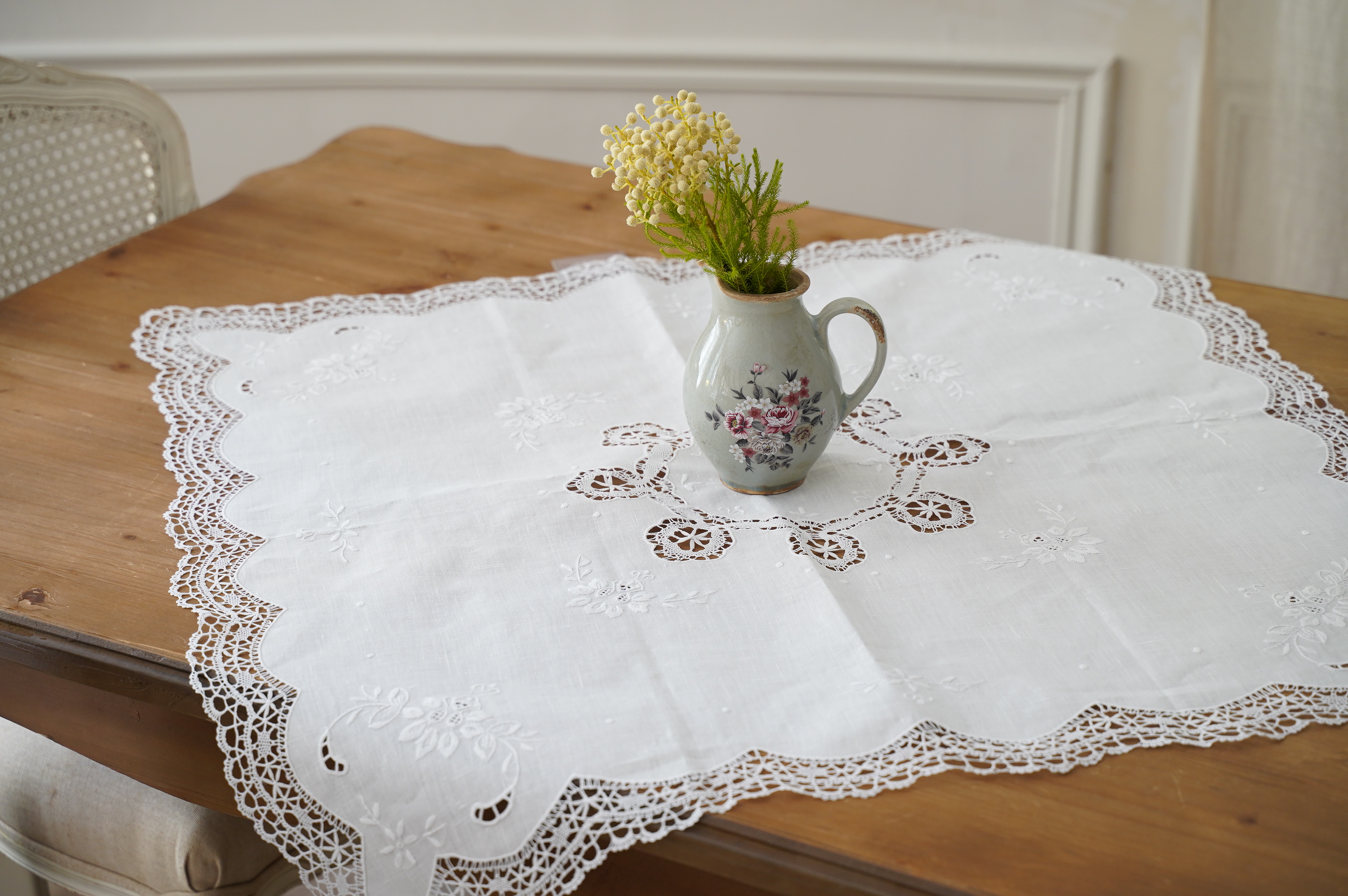非常典雅法式蕾絲桌墊, 綿麻混織精緻刺繡花朵, 無論是手工繡花、還是蕾絲編織, 清雅的色彩、細膩的質感, 描繪出一種緩慢的法式生活風情~ 早餐時刻或是悠閒的下午茶時光, 舖在餐桌、茶几, 就能為單調的桌面換上迷人的風貌, 享受恬澹夏日的一抹閒適~